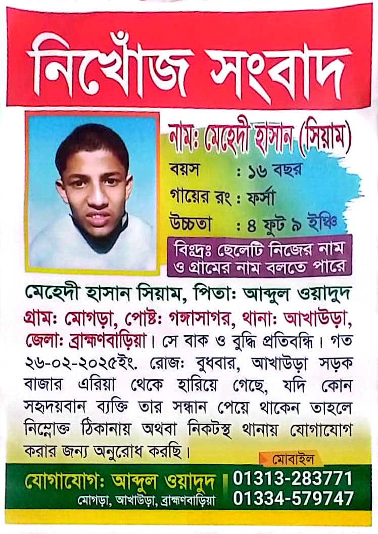 নিজস্ব প্রতিনি রবিউল আজম ব্রাহ্মণবাড়িয়া জেলার আখাউড়া উপজেলার মোগড়া গ্রামের এক কিশোর দীর্ঘদিন ধরে নিখোঁজ রয়েছে। নিখোঁজ কিশোরের নাম মেহেদী