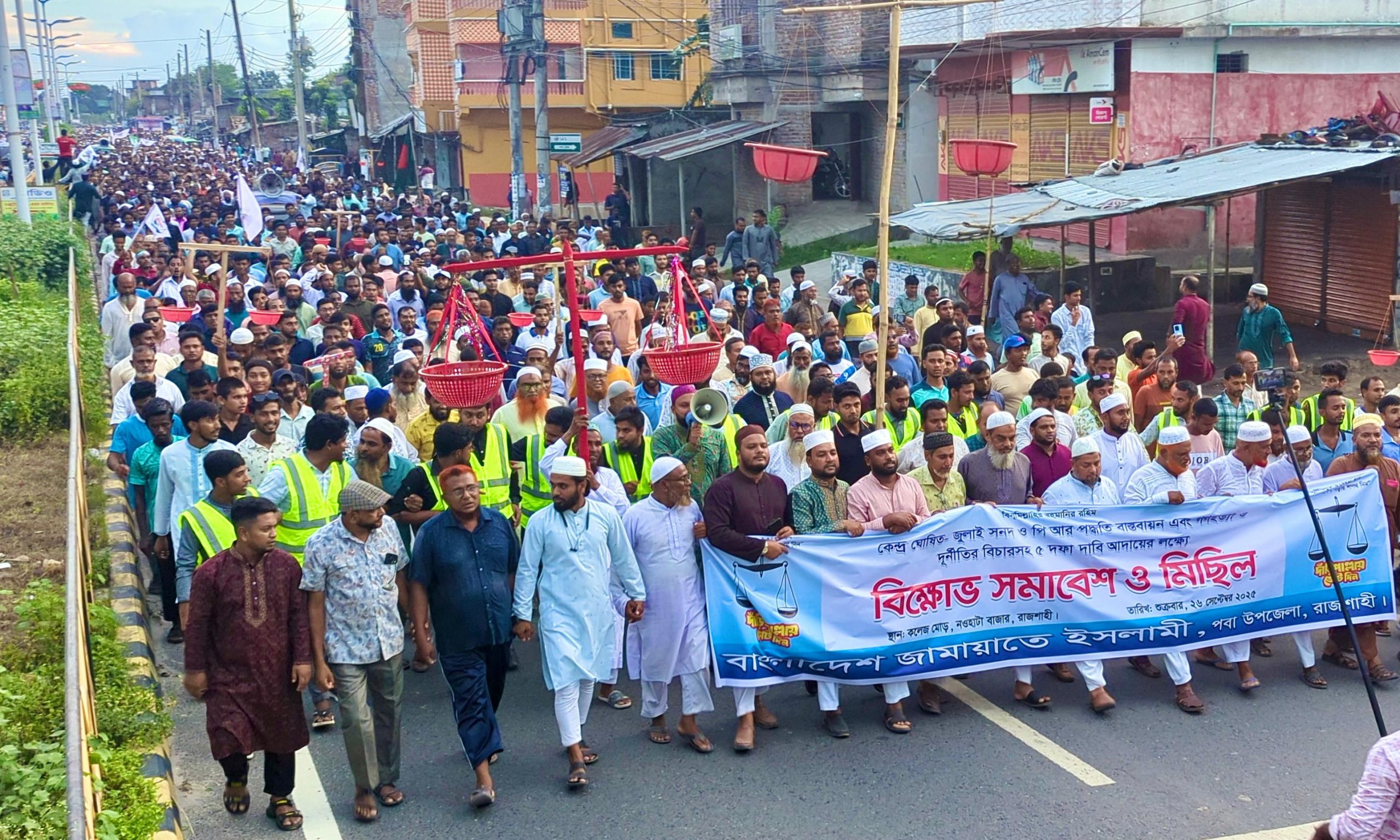 রাজশাহীর দুর্গাপুরে বাংলাদেশ জামায়াতে ইসলামী উপজেলা শাখার উদ্যোগে এক বিশাল বিক্ষোভ মিছিল ও সমাবেশ অনুষ্ঠিত হয়েছে। শুক্রবার (২৬ সেপ্টেম্বর ২০২৫)
